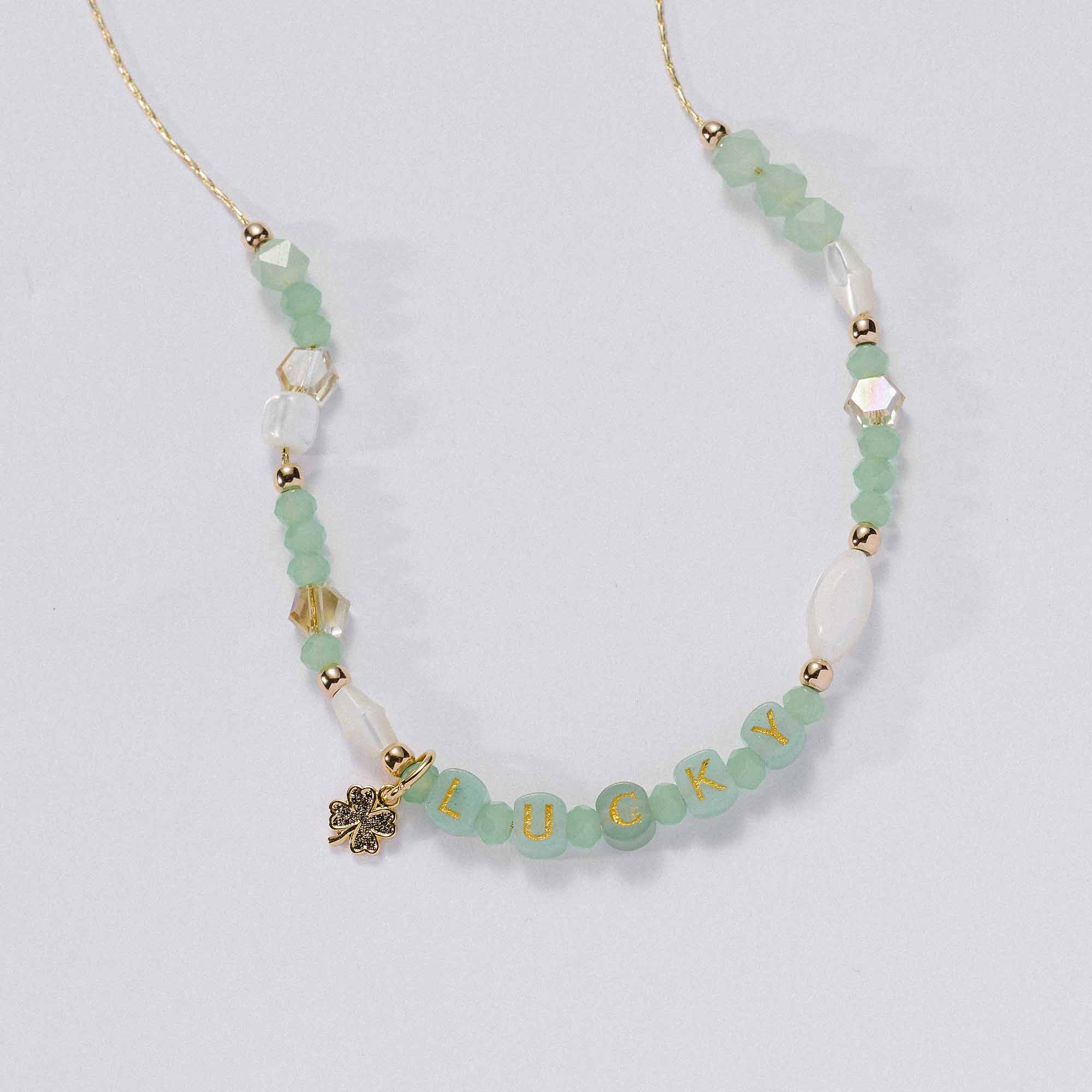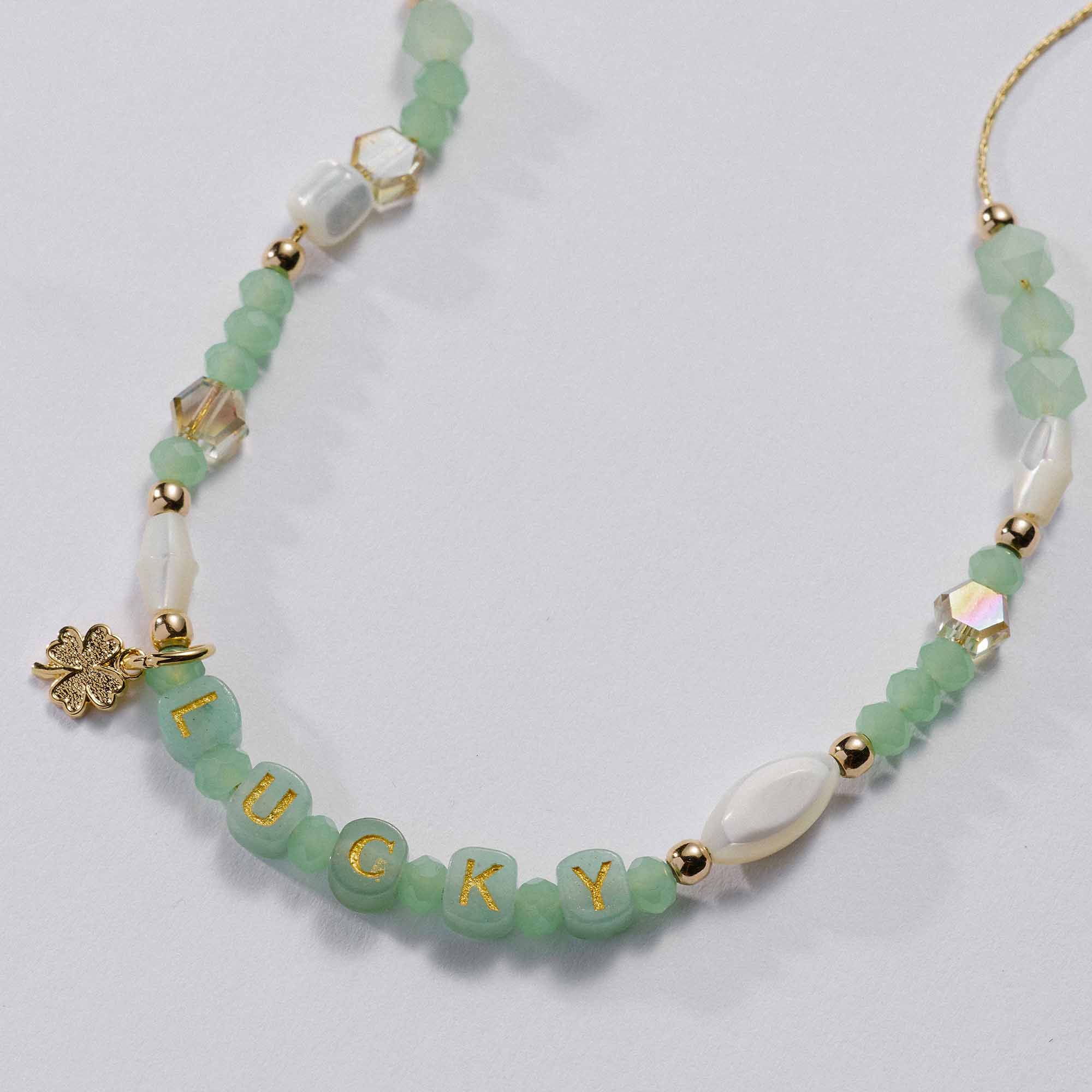 Hand-strung with genuine green aventurine beads, LUCKY spelled out front and center, and finished with mother of pearl, crystal, and metal accents. A mini four leaf clover charm adds one more touch of good fortune.