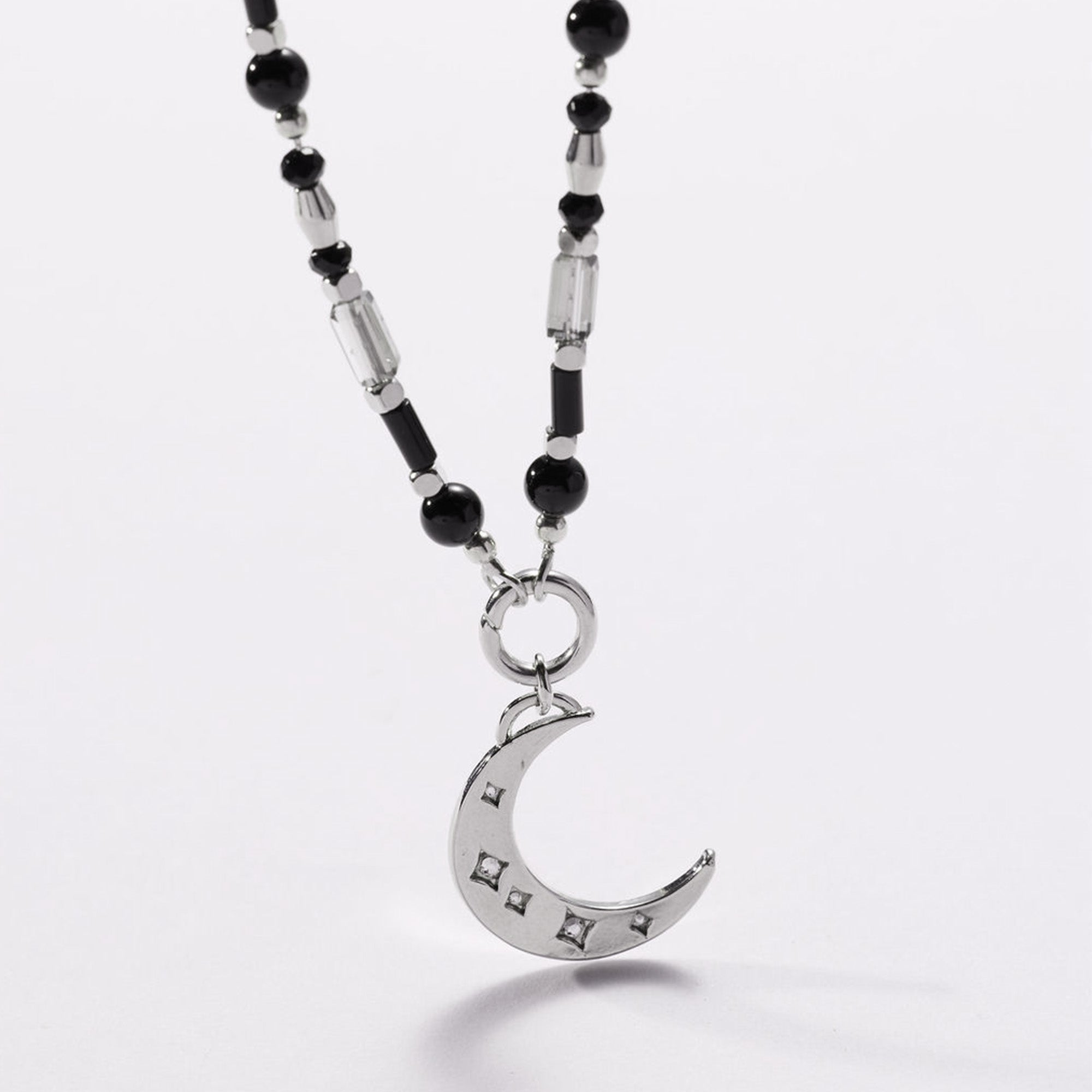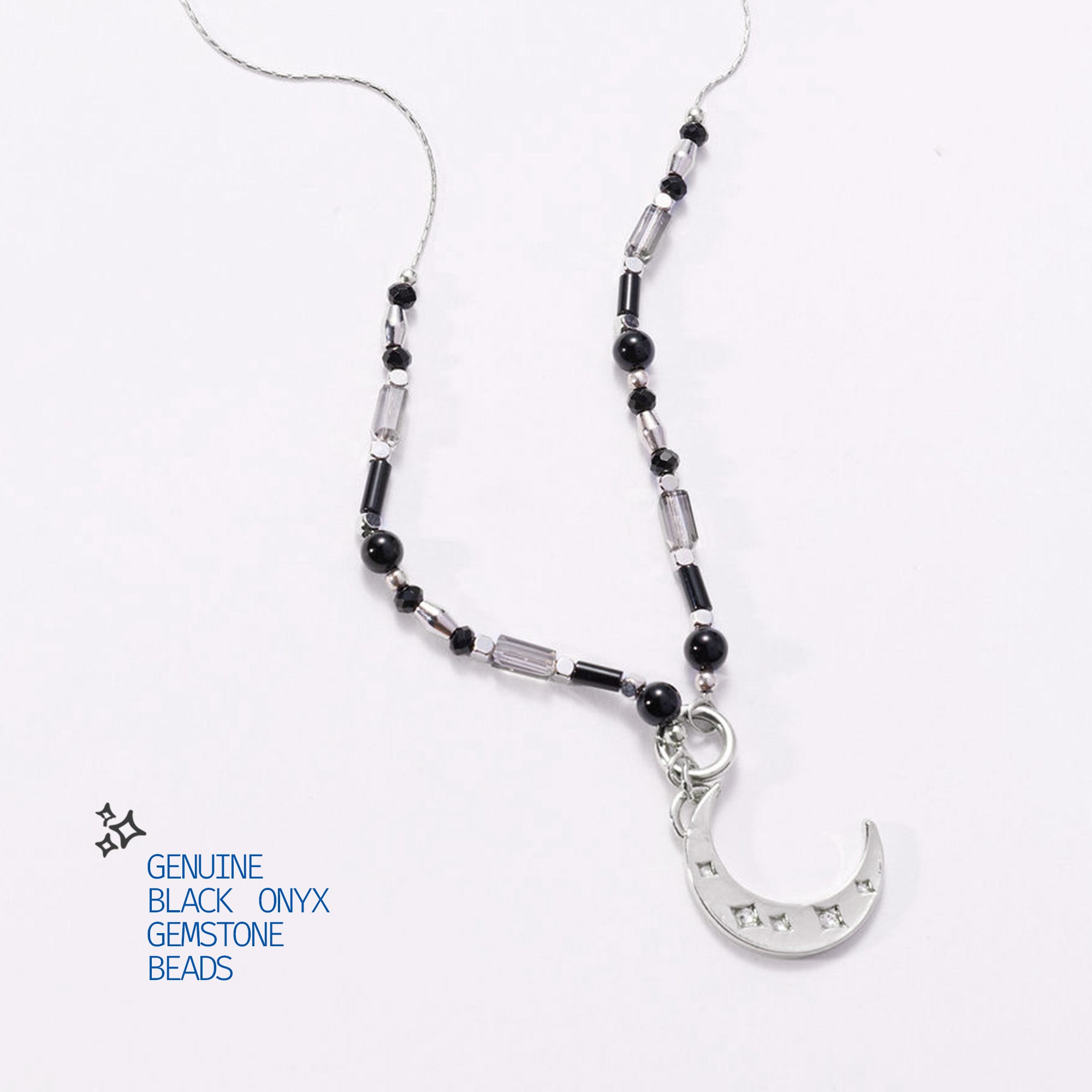 Hand-strung genuine onyx and glass beads on chain, finished with our invisible center link holding the crescent moon intention charm. Adjustable from choker to 26”.