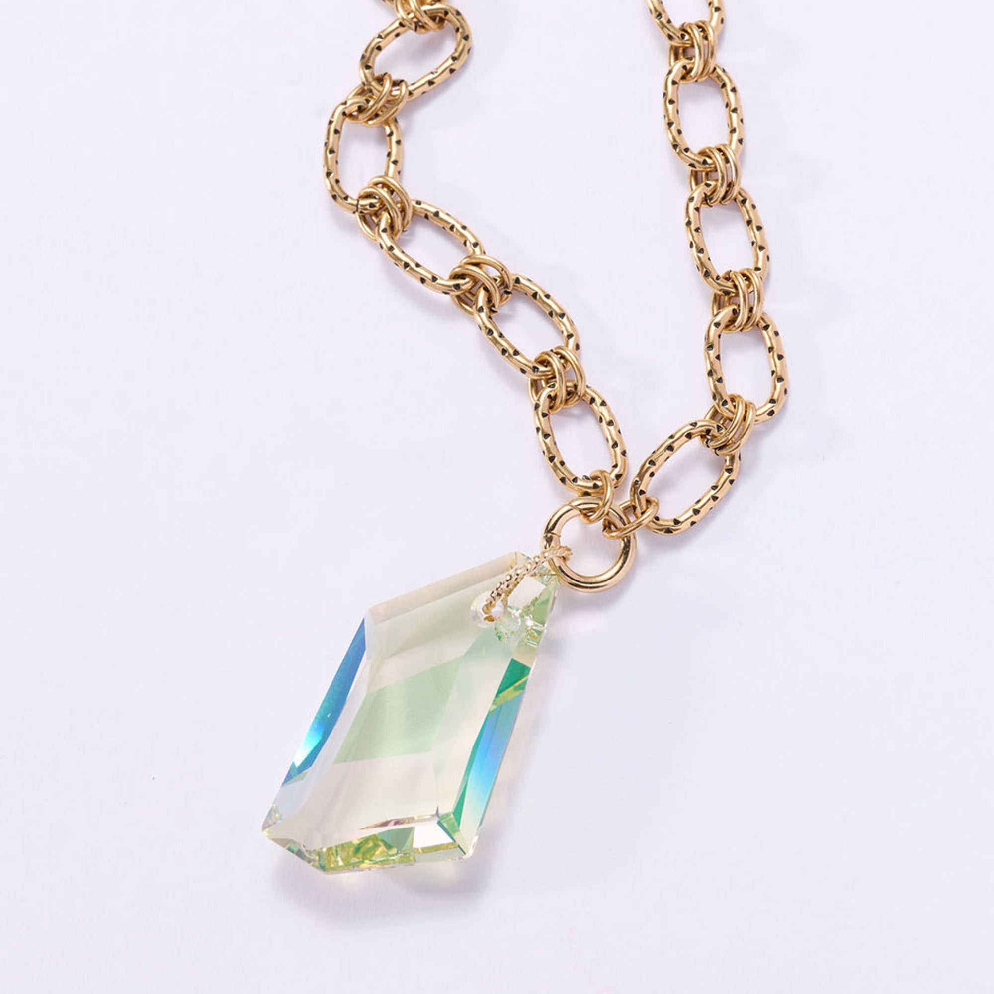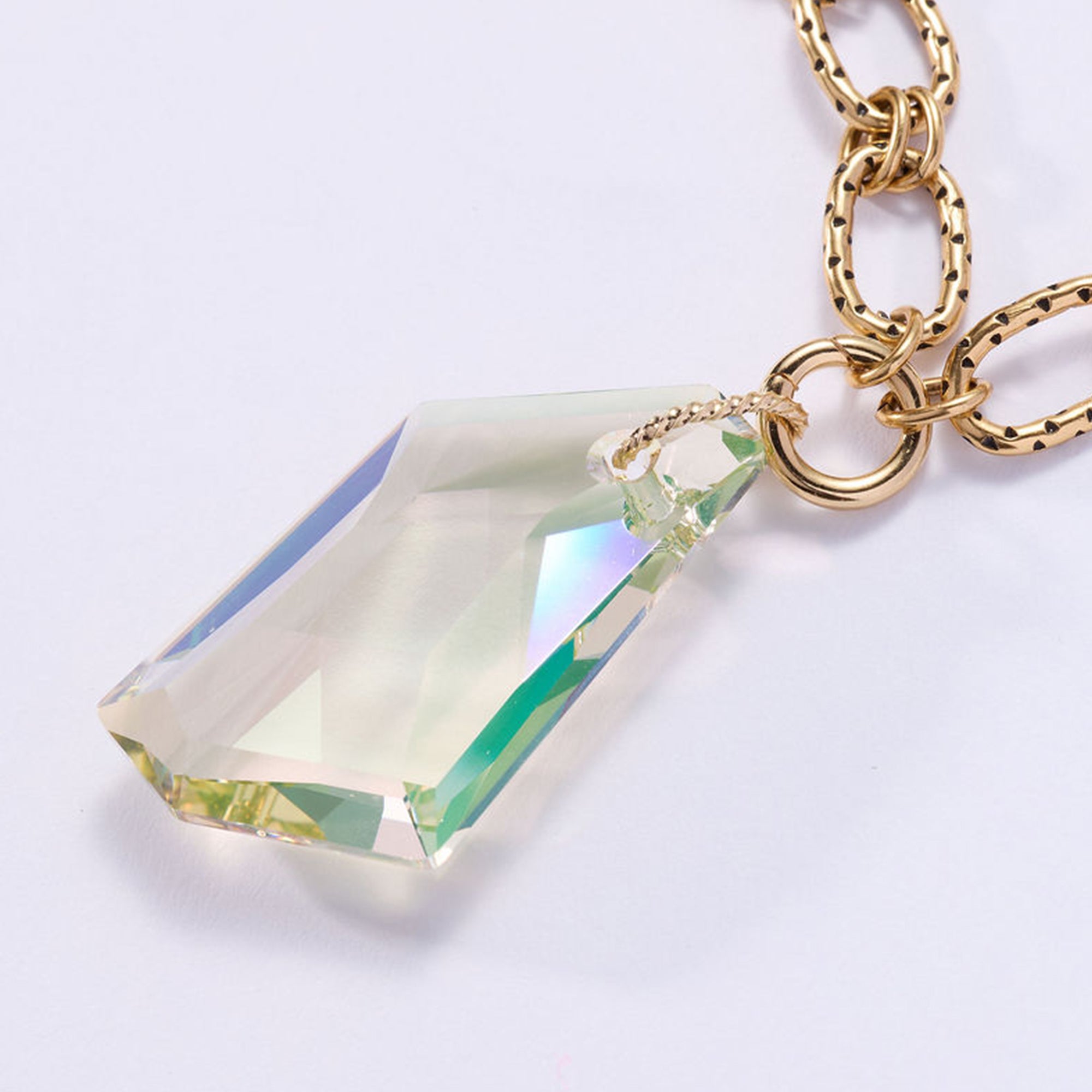 For this second release, Sunshine Deco is paired with a vintage-finished oval link 24" chain featuring subtle studded detailing along each link. The textured links add a more architectural edge while keeping the softly aged glow that defines the piece.