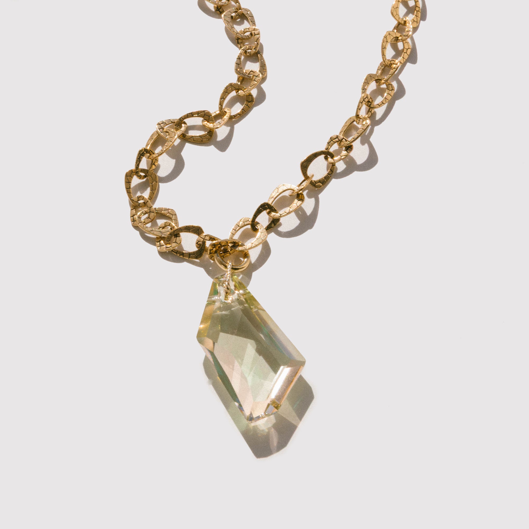 Designed in-house using rare archival crystal — a 50 mm Art Deco–cut stone in a warm, sunlight hue. Each one features a hand-linked bail with our signature charm holder on a 24" vintage-inspired triangle chain, finished in antique gold for a softly aged glow.