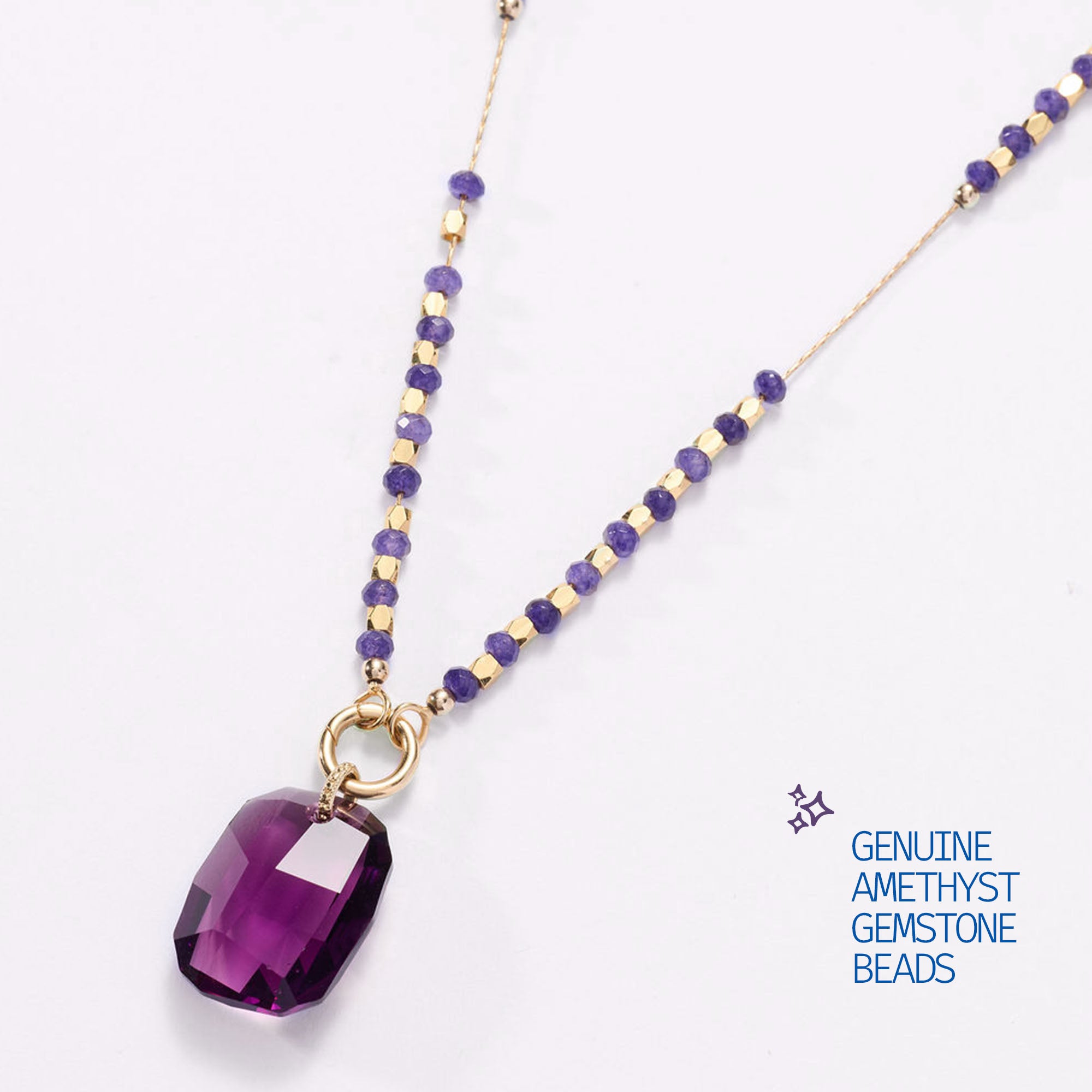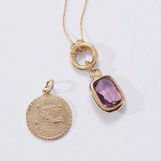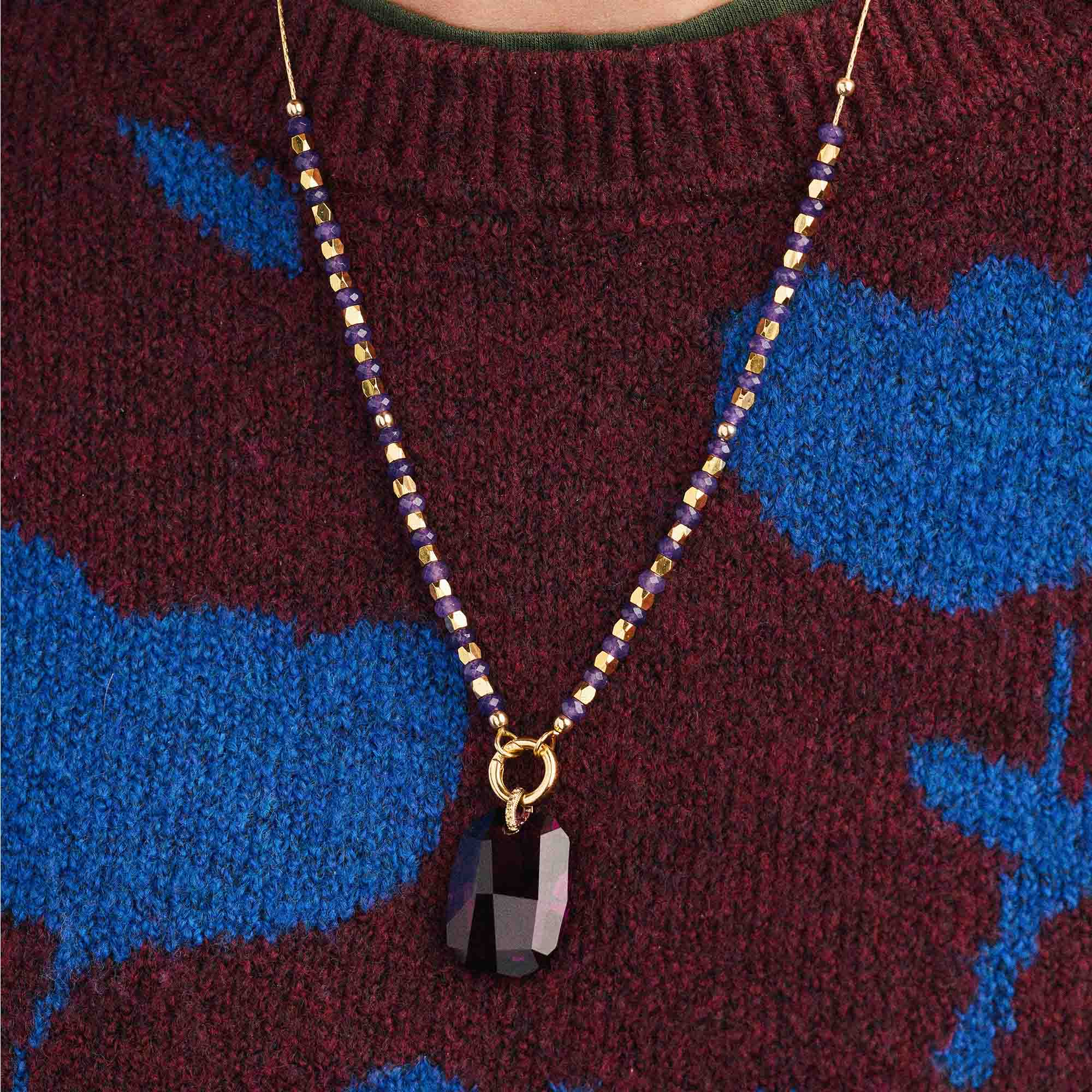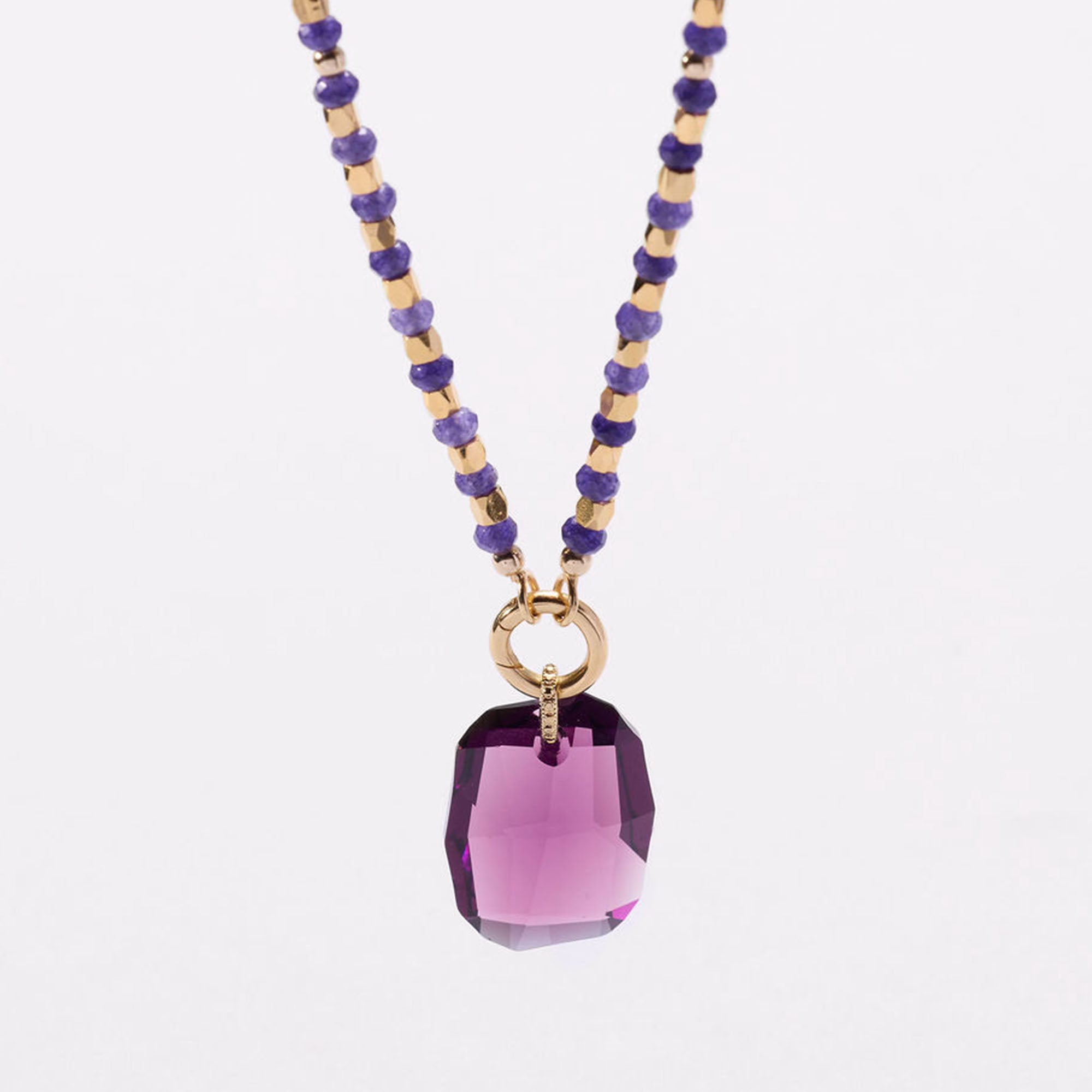 A one time release from our design archives, the Amethyst Hour Necklace features genuine amethyst gemstone beads paired with metal beads. At the center, our signature charm holder holds an 28mm" authentic Austrian crystal pendant in an Amethyst tone, cut to catch light as it shifts from day to evening.